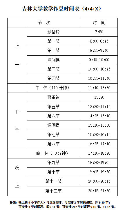 校内各有关单位: 为更好的适应学校教学工作发展需要,优化学生课程安排,提高学习工作效率,经学校2023年第17次校长办公会审议通过,对我校教学作息时间做出调整。新教学作息时间自2024年春季学期开始执行,请各单位遵照执行并做好各项准备工作。