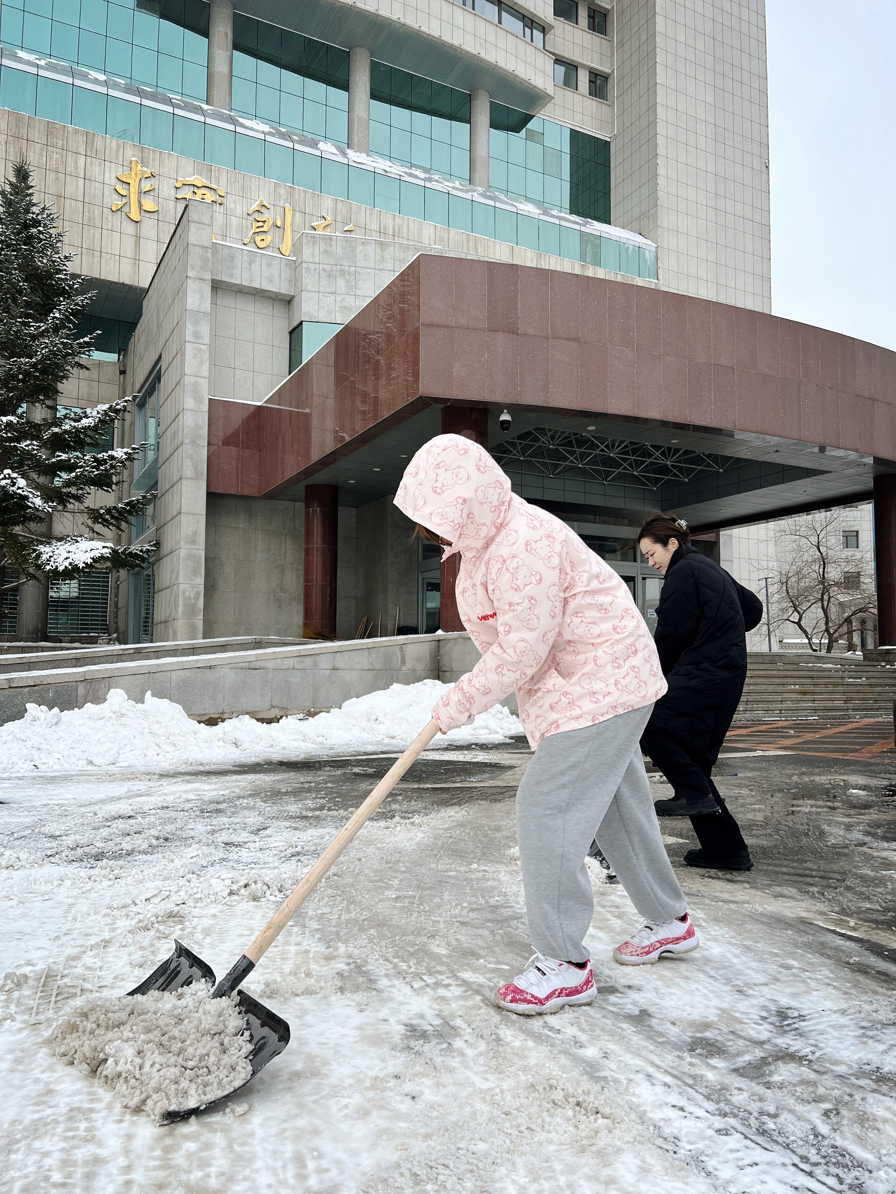 办公地点水务楼地处校园外东南角,大楼东北向有一个面积较大的停车场。进入11月以来,持续的强降雪天气为交通和出行带来极大不便,学校机械化扫雪队伍第一时间照顾不到这里,地面清雪全靠大楼内的保安和物业人员。行政教工党支部注意到清雪人力物力不足、人员长期劳作身体疲惫的情况,11月11日上午组织党员对水务楼门前积雪进行了清扫。