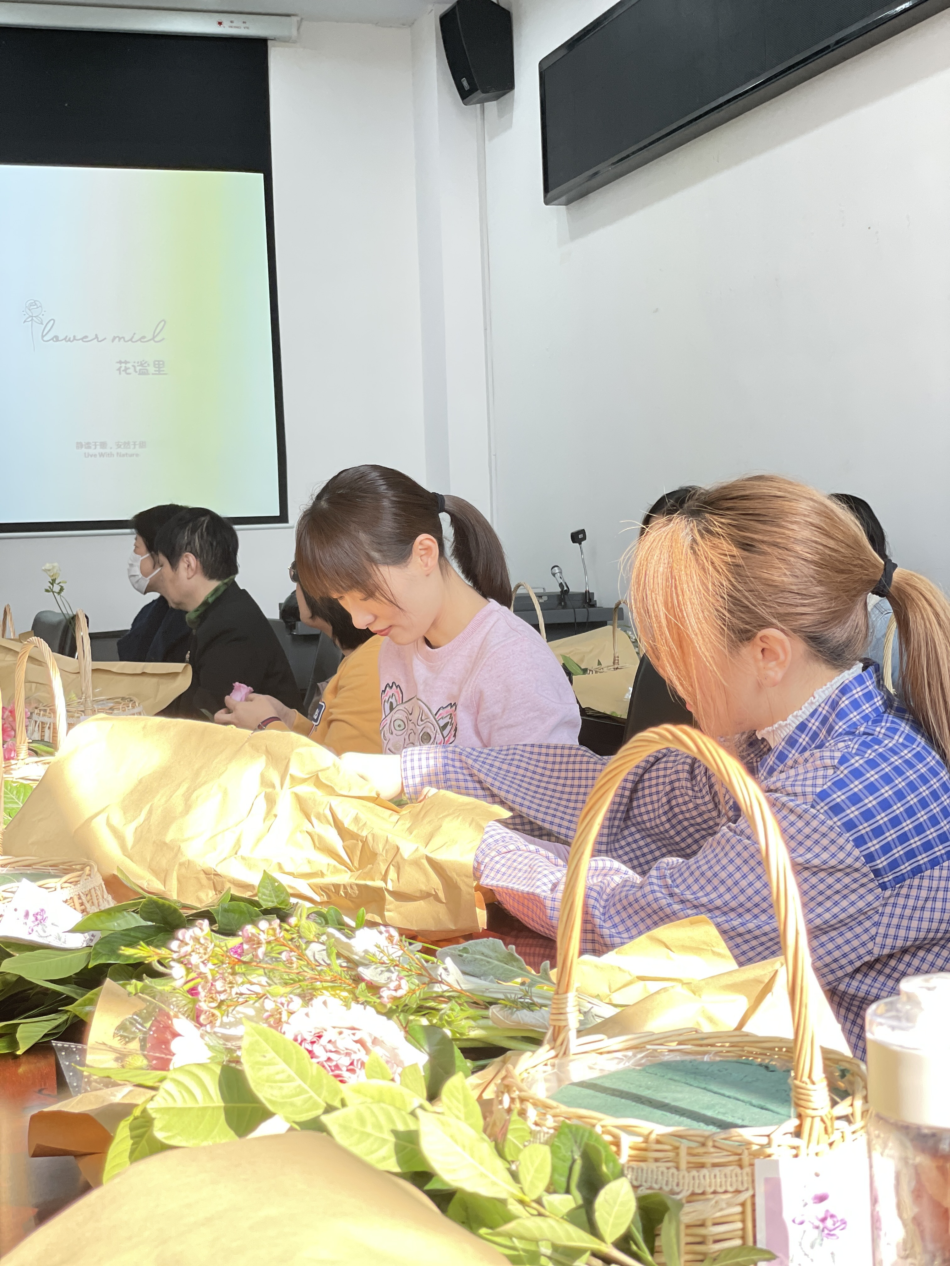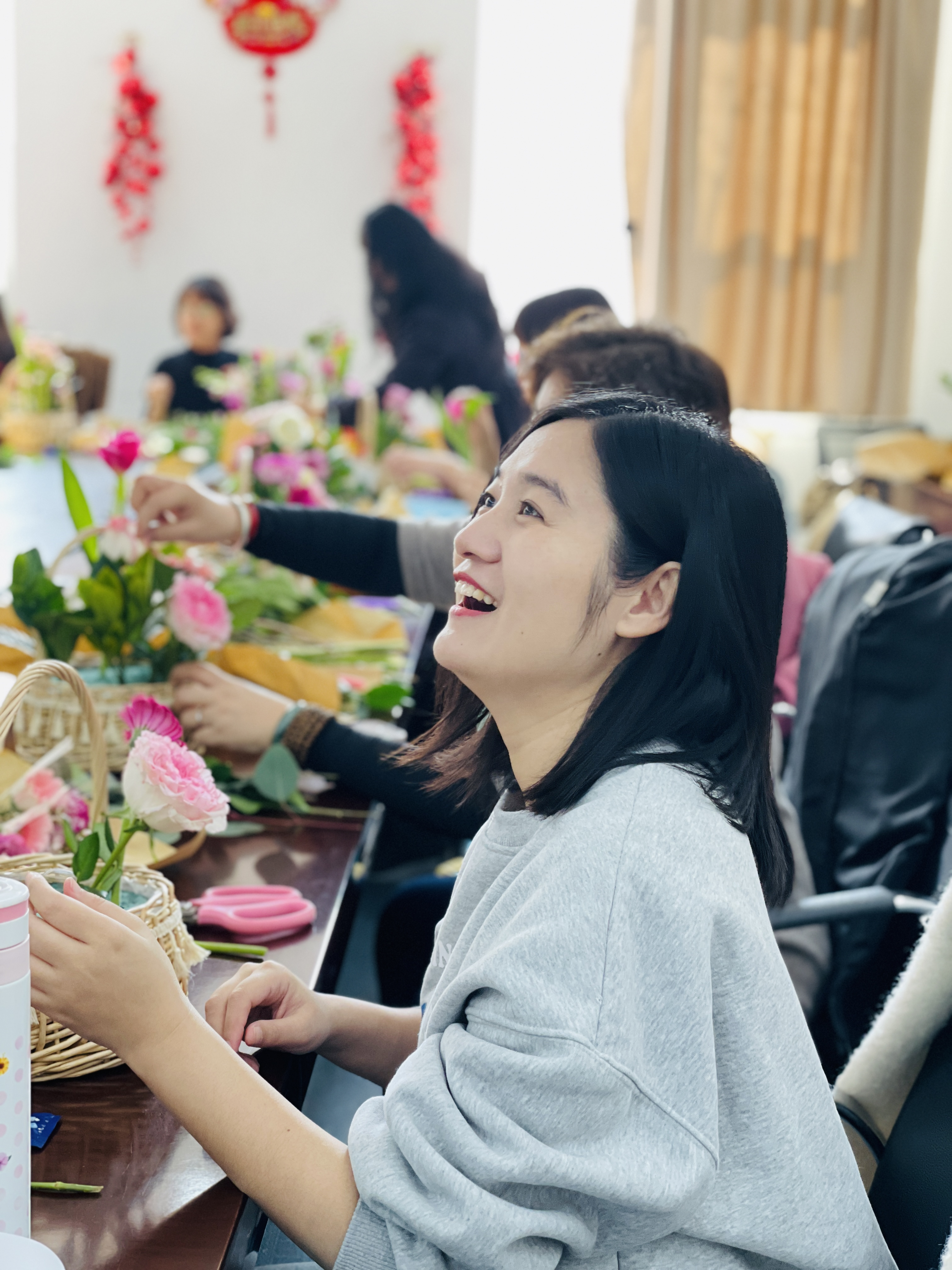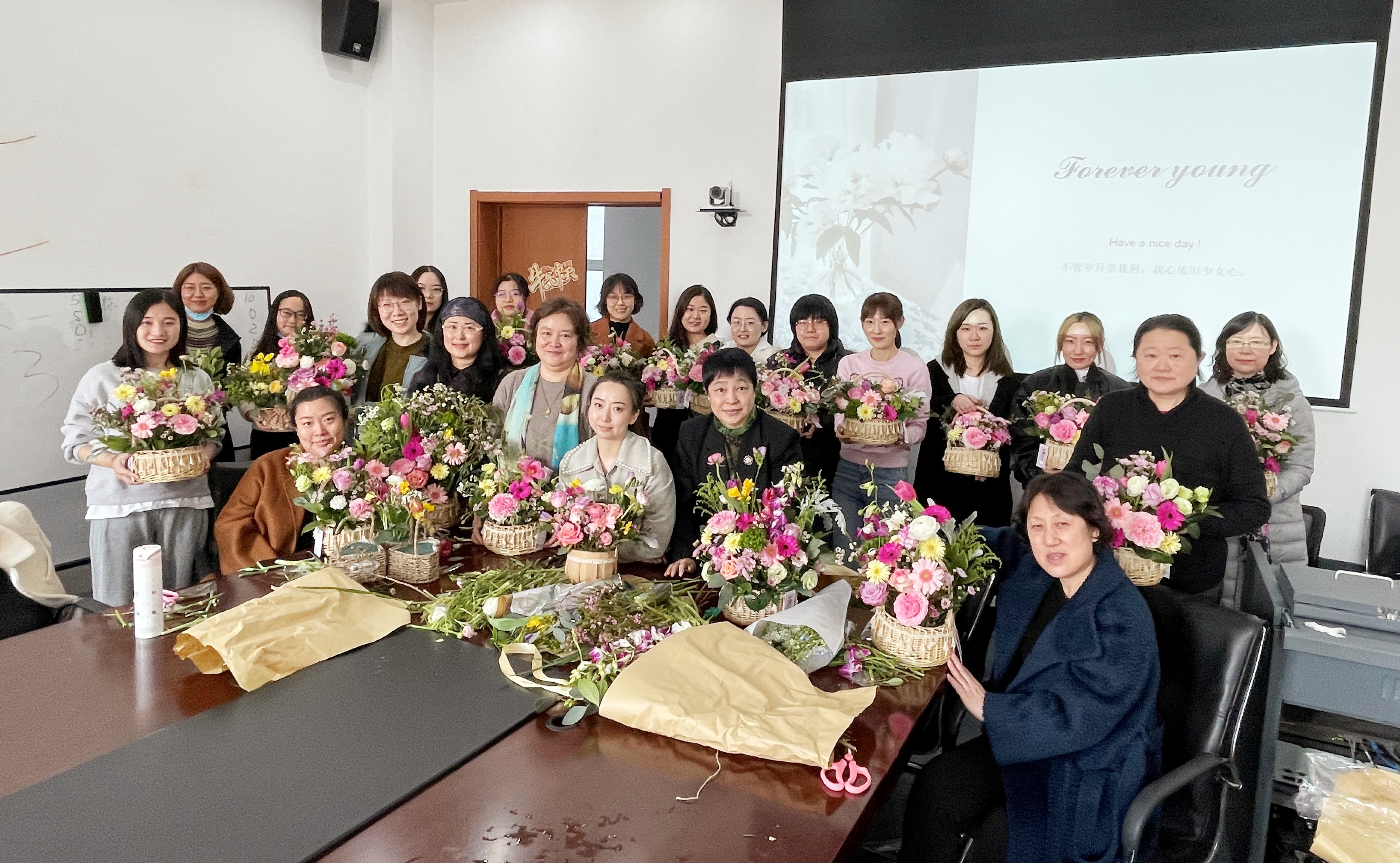 李宏伟代表学院党委对女教职工表示了节日的问候。吕军对学院的关心和支持表示感谢。艺术指导老师介绍了插花的历史、分类和基本操作顺序后,在场人员开始纷纷打造自己心中的小花园。插花过程中大家学习交流着花草的习性、生长周期等知识,对比着不同人插花的结果,春天伴随着花枝的摇动起落悄然降临。