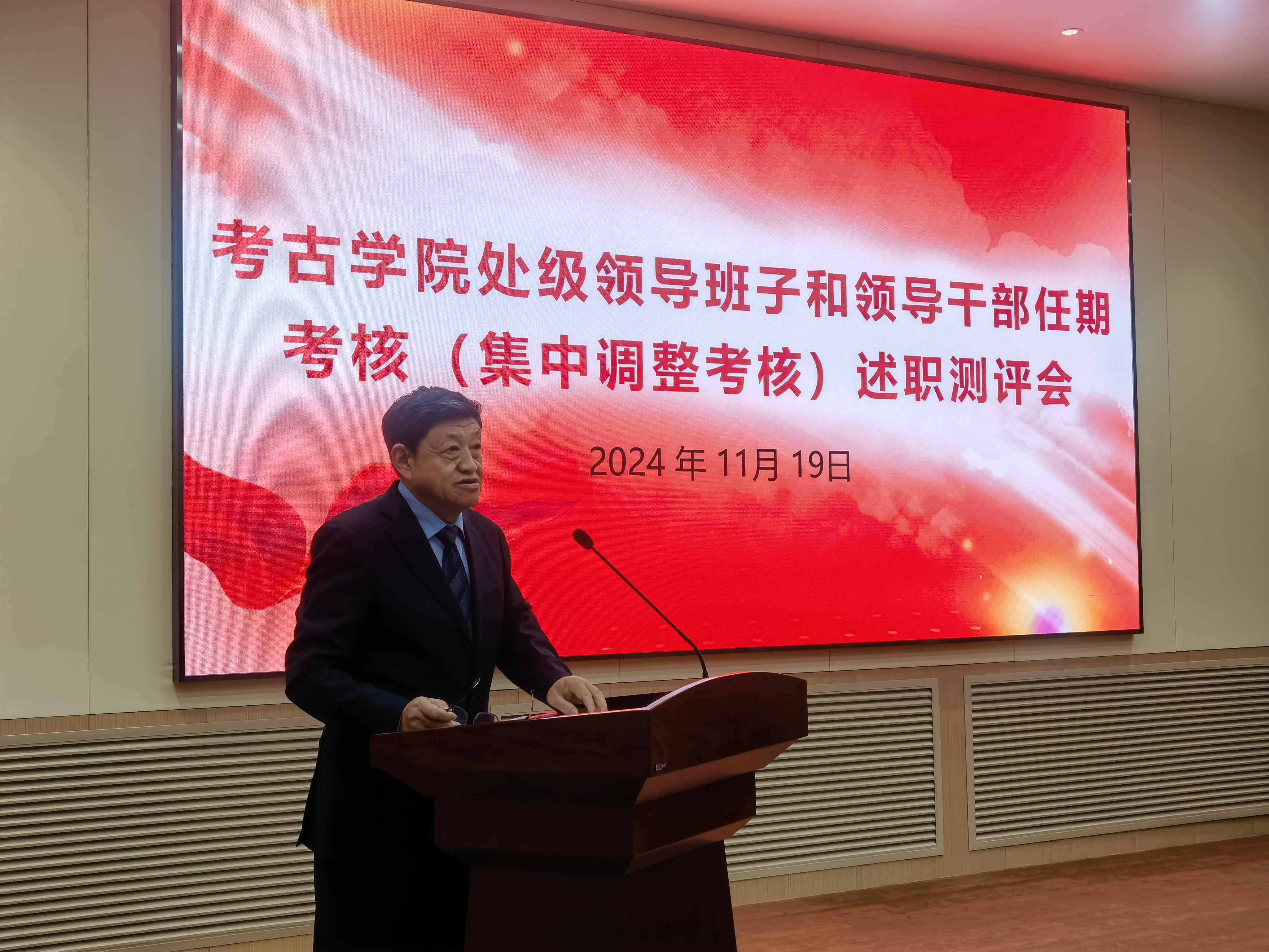 在正新楼一楼报告厅召开处级领导班子和处级领导干部任期考核述职测评会议。学院党委全体教职工参加会议,会议由院长赵宾福主持。