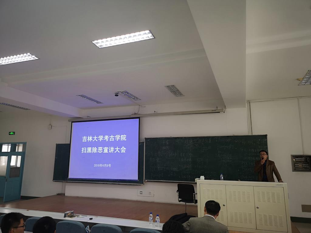 于中心校区第三教学楼第一阶梯教室召开了“扫黑除恶”专项斗争工作学习宣传会。本次大会由院党委书记王剑教授主讲,学院党委副书记兼副院长侯建峰、学生工作办公室主任杨晨、研究生工作办公室主任魏来以及学院全体本科生、研究生参与本次会议。