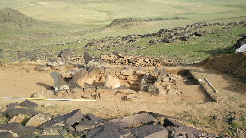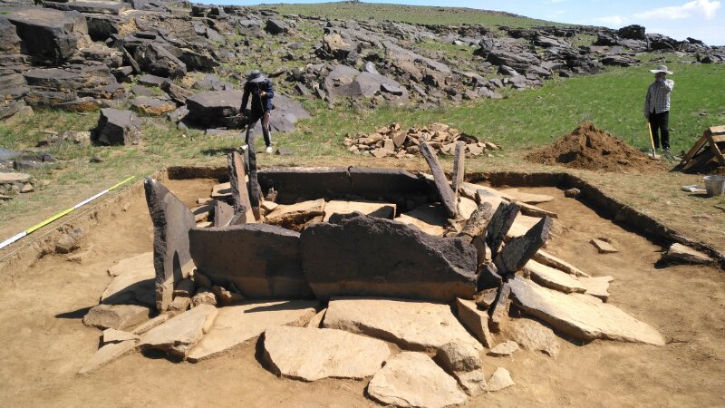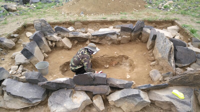 边疆考古研究中心曾与蒙古国立大学人文学院人类学与考古学系合作,对图音河中上游地区的数处石构墓群开展过初步的考古调查。本次发掘工作主要针对曾经调查过的达黑拉吐地点和新发现的朝伦昂古奇特地点的石板墓群展开。其中在前一地点发掘小型石板墓5座,有3座保存完整,2座早期被扰;在后一地点发掘大中型石板墓4座,均被早期扰乱,有1座又被现代再次盗掘。墓葬平面形状均系长方形,多呈东北—西南向,沿山坡的水平方向设置。地表挖有浅穴,浅穴的四壁立砌大小不一的石板构成石围,一般墓葬的北壁与南壁石墙长度要大于东壁与西壁石墙的长度,且墓葬四角(即墓葬北壁与南壁的两端)所立石板要比其它部位的立砌石板更为高大。从保存较好的墓葬看,墓内堆积均分为两层,第一层主要为大小不一的石块堆积而成,缝隙间有灰黄色淤土。第二层为一薄层黄灰色沙土。其下墓框中间部位为圆角长方形或长椭圆形墓坑,墓坑深10-50厘米不等。墓坑口部覆盖数量多少不一的石盖板。未被扰乱的人骨皆仰身直肢,头向东或东北。9座墓中均发现有殉牲,未被扰动的殉葬羊头或牛头均置于墓主人头端左侧二层台上,而羊或牛的肩胛骨多置于人的两腿之间。墓内随葬的人工制品较少,发现有少量陶器残片、骨镳、玛瑙珠、砺石等。陶器器形可辨者有鬲、筒腹圈足罐、敛口弧腹平底罐等,有两件陶罐基本可复原。