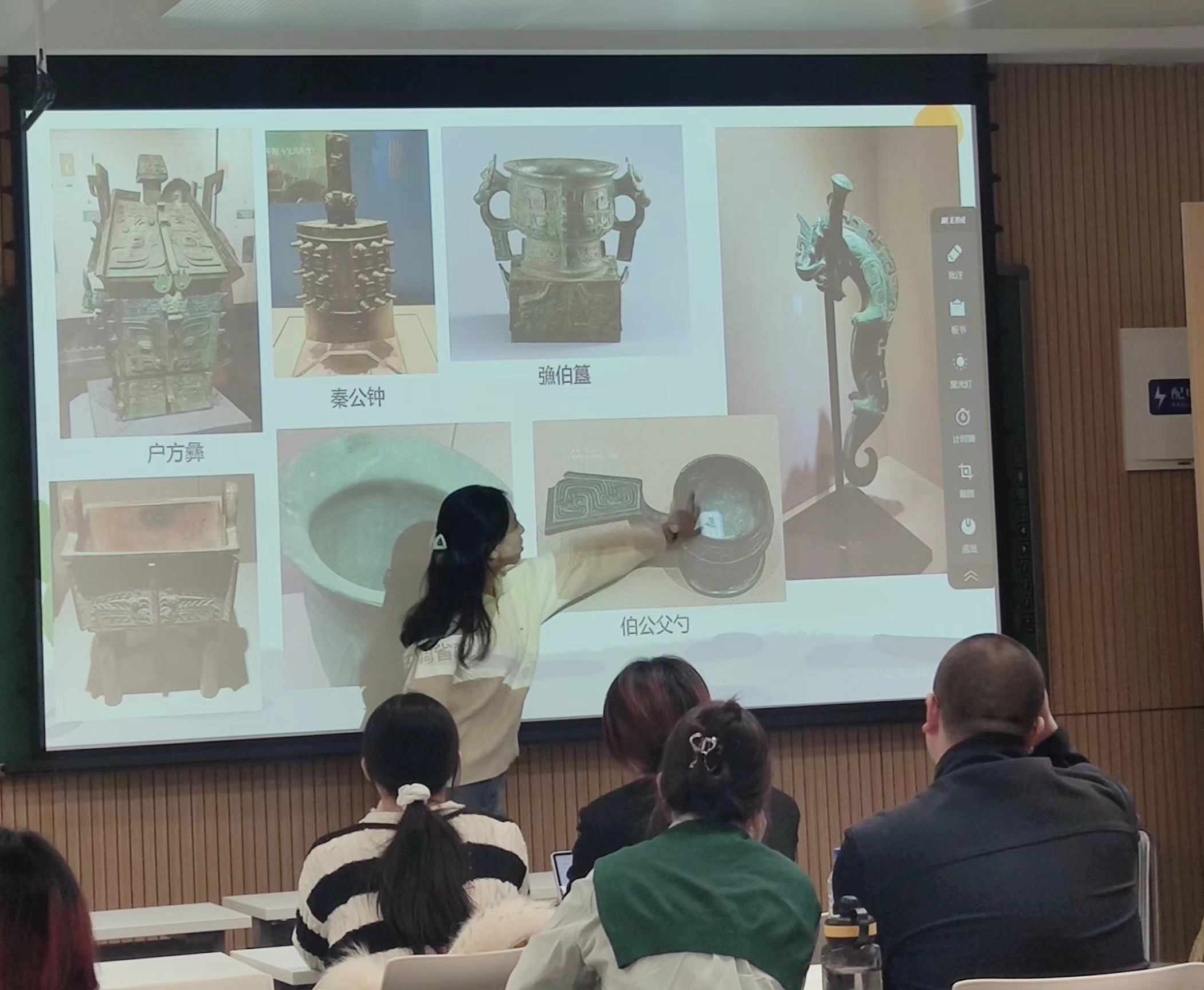 张风怡、李盈玉两位同学分别就古文字实习的上半程和下半程向大家作详细介绍。她们将古文字学专业历时20天,辗转河南、陕西、山西三省,历经郑州、安阳、西安、宝鸡、运城、太原六个城市的实习经历娓娓道来。在此期间,他们不仅到各大博物馆与考古工作站进行了调研学习,还与考古、文博专业的同学们汇合,交叉学习、分享经验。