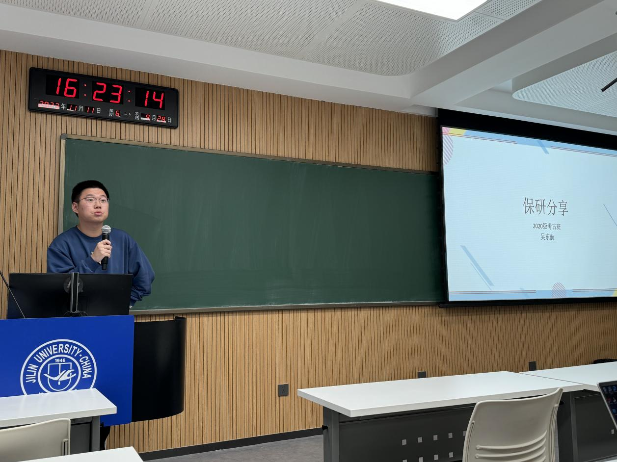 随后,保研至本校的徐子姣、吴东航同学进行了分享。徐子姣结合自身学习经历与心路历程,强调了工地实习和保持良好心态的重要性,她真诚的分享不仅使同学们对保研的时间线、准备工作有了进一步认识,也更加彰显了考古学的学科魅力。吴东航同学围绕对考研概念的解析,结合个人报考经验、复试经验,为同学们提出了普适性的建议。
