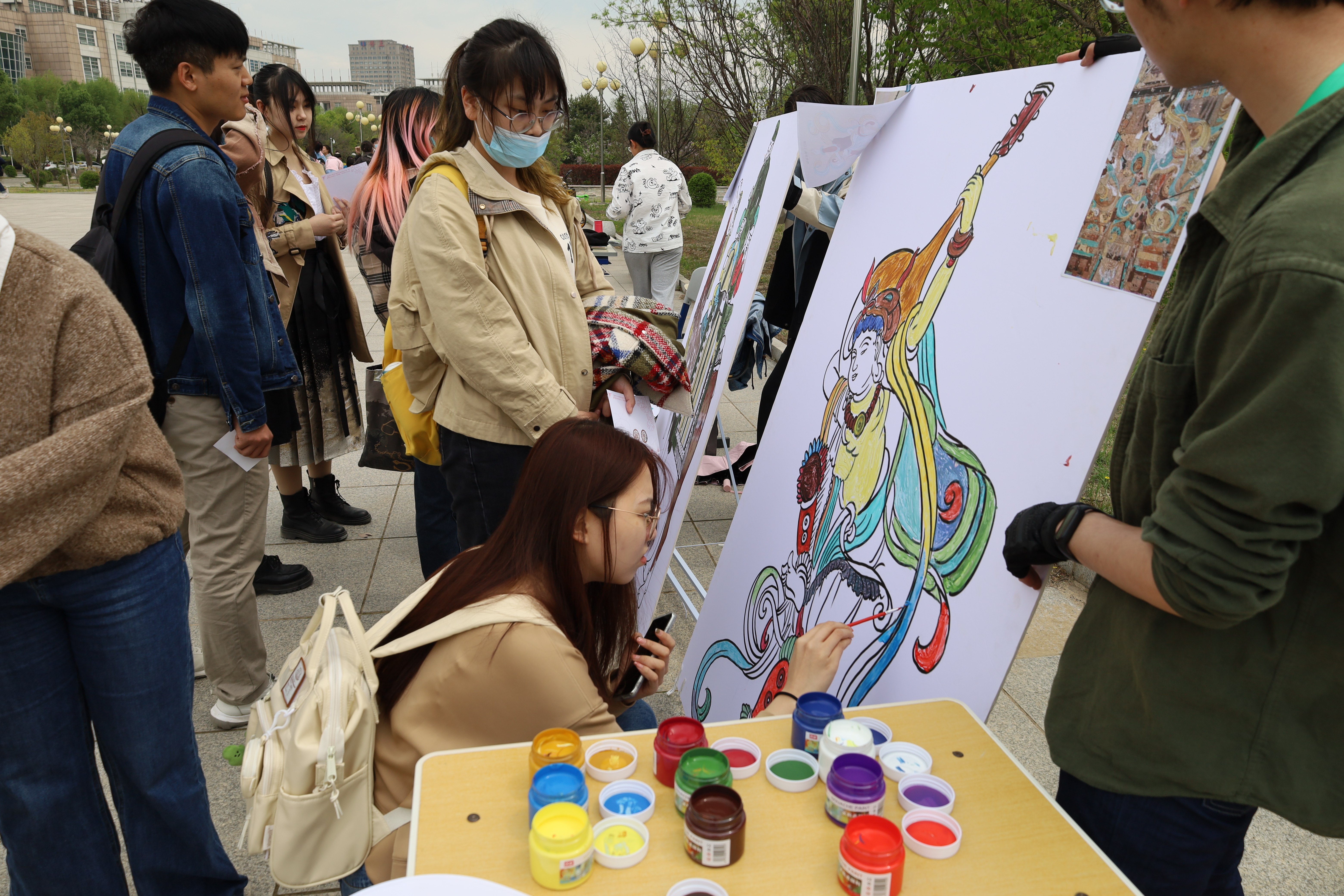 用颜料浸润古今,以丰富的色彩勾描历史画像。画笔多样,画手相异,画下的填色亦是百态层生,或沿着文物既定的形制和色彩,或倾泻天马行空的奇思与妙想,留下一个个斑斓的美学形象。在细细刻画唐三彩与飞天的迷人与优雅之外,参与者的作品也未拘束在线条的框架中,在空白处以彩色留下今日与考古的相遇,绽放春日的奇迹。