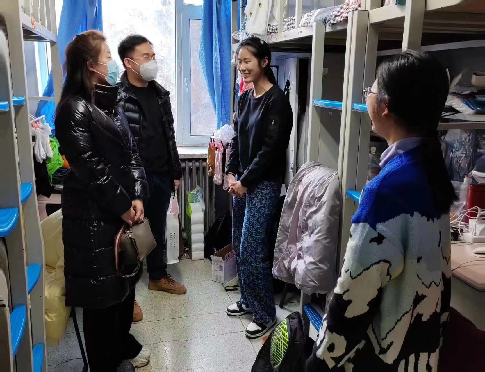 学生工作办公室主任杨晨、辅导员马嘉男、邱泽涵来到学生宿舍,探望全体本科同学。