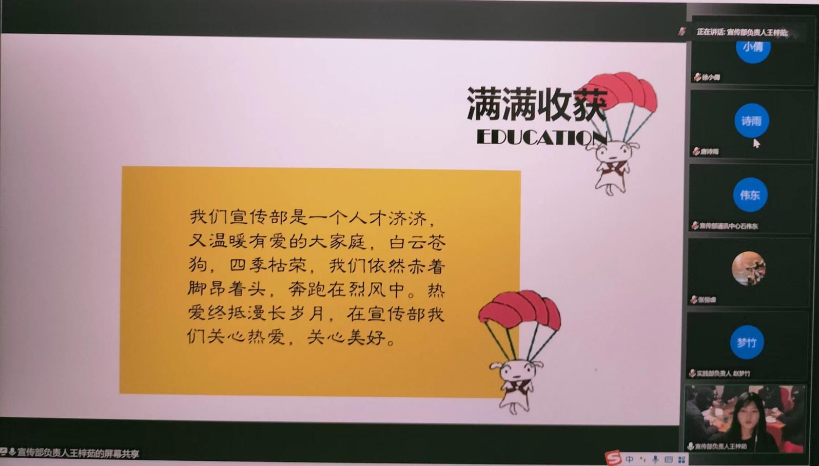 随后,团委各部门负责人以部门过去一年的具体工作经历为主线,结合自己的工作感受,展开了部门介绍。办公室负责人于涵宇介绍了办公室在团建、团课中协调各方的重要作用和在制定活动计划、加强思想建设等方面的特殊作用;组织部负责人钟孟跃说明了部门主要负责的团组织建设、团员教育管理工作,以及完成上述工作所需的认真细致等特质;实践部负责人赵梦竹讲述了部门组织社会实践、传达实践信息等工作内容,展现了工作中培养的社会责任感;宣传部负责人王梓茹分别介绍了通讯中心、新媒体中心在宣传工作中承担的任务,彰显了宣传部体量大、任务多的特点,鼓励对摄影、撰文感兴趣的同学加入。