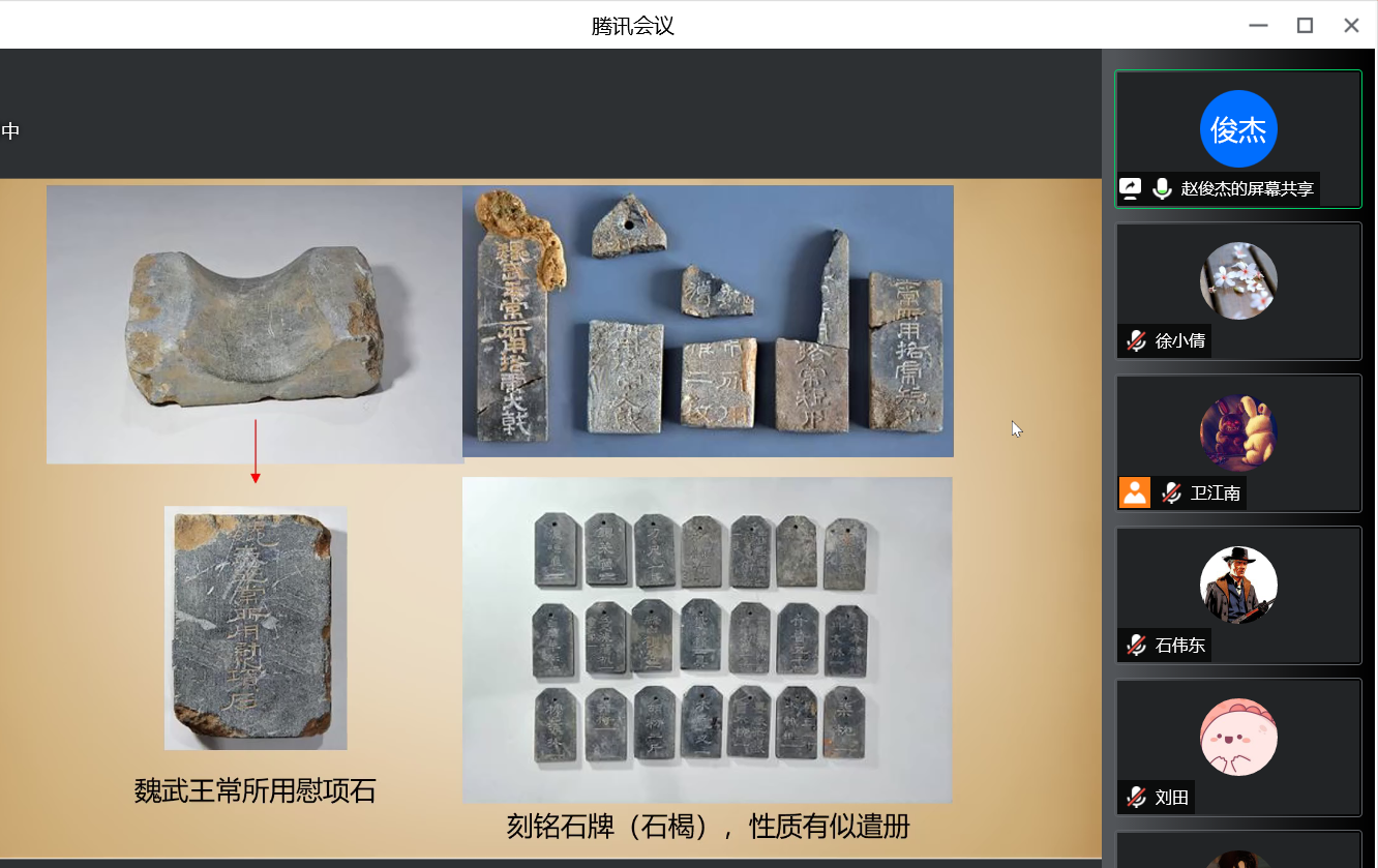 跟随着赵俊杰老师的讲述,同学们层层深入,共同认识了魏晋帝陵五个层次的内容:首先是魏晋帝陵的概况。曹魏时期有文帝曹丕首阳陵、明帝曹叡高平陵,西晋帝陵还有宣帝高原陵、景帝峻平陵、文帝崇阳陵、武帝峻阳陵与惠帝太阳陵;同学们“云”参观了帝陵的墓道、甬道和墓室之后,对帝陵的全貌有了更深入的了解。魏晋帝陵出土了丰富的随葬品,如陶器、铁器、铜器、漆木器、玉石器……刻有与日常生活相关内容的刻铭石碑亦种类繁多,十分丰富,是该历史时期考古发现的璀璨明珠。