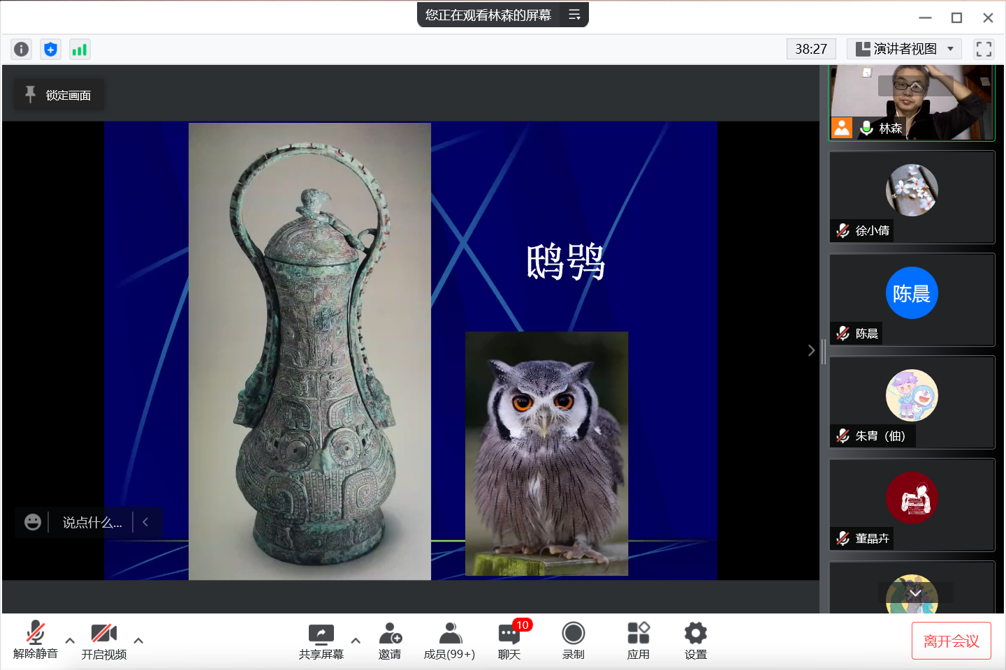在云课堂上同学们紧跟老师思路,认真思考,对青铜纹饰的识别方法等提问,并踊跃参与互动回答,最后的有奖竞猜环节同学们积极发言,课堂气氛十分活跃。