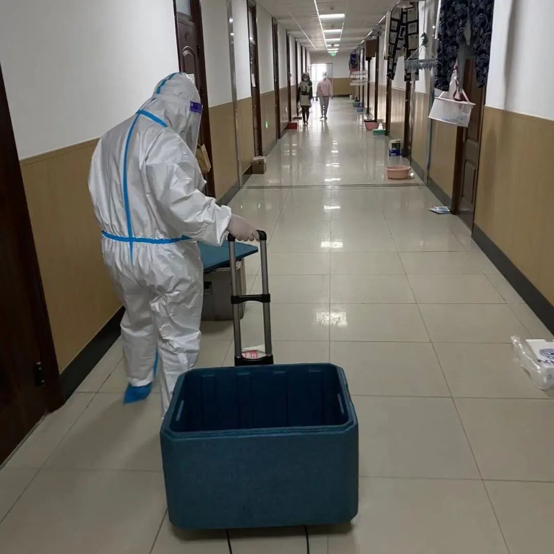 除了志愿者,保洁阿姨们也在为了保持学生居住环境的整洁默默付出着,她们每日穿着厚重的防护服,打扫着学生公寓百余间盥洗室的卫生。与我们交谈时,阿姨说“学生都非常理解我们,我们把宿舍卫生情况搞好,孩子们住的也安全。”