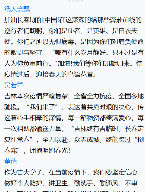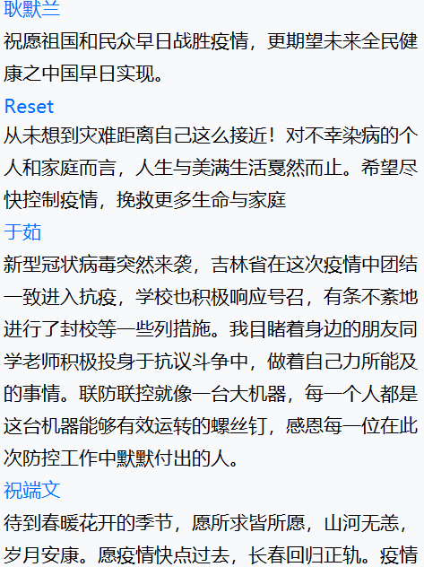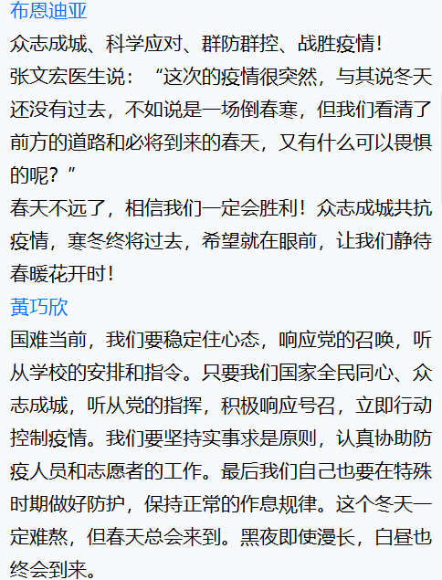 尽管本次班会在疫情中举行,大家只能通过线上的方式交流,但是同学们仍然积极、主动参会,并且通过网络会议表达了对一线抗疫人员的敬佩、对抗击疫情必胜的信心,充分展现了青年学子的责任与担当意识。相信只要我们携手抗疫,同舟共济,一定会战胜疫情!