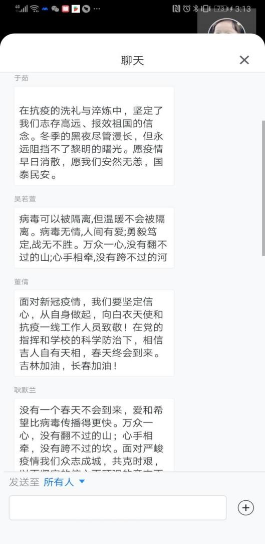 下午三点,会议准时开始。首先,团支书耿墨兰向各位参会同说明了本次举行线上会议的主题,并向大家分享近段时间以来长春市和学校的疫情防控形势,要求大家做好个人防护,配合学校打好疫情防控阻击战。随后,冯楠老师鼓励各位同学踊跃发言,阐述自己关于抗击疫情的感想和抗疫宣言。会议上,大家积极献言,很多同学表达了鼓励同学、感谢一线工作人员的感言。大家用朴素而真挚的语言表达了对抗疫必胜的决心与信心。会议最后,冯楠老师向各位同学转达了学校以及学院对大家身体的密切关注,并再次强调了在宿舍封闭管理期间的注意事项。
