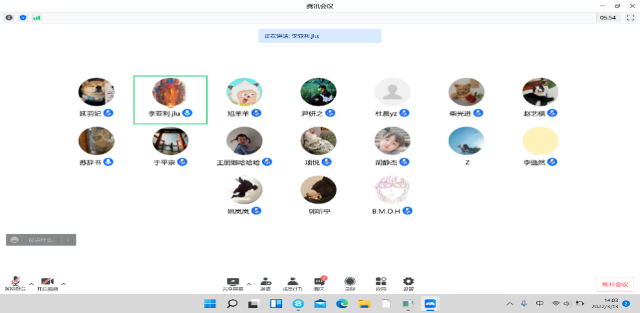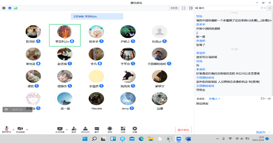 2020级文博班召开了线上防疫导学主题班会。会议由班主任李亚利老师主持,班级全体同学参与了此次会议。会议伊始,李亚利老师首先针对校内的生活物资供应,同学们的日常饮食配送等方面的内容作了详细介绍。强调了个人隔离防护的注意点:宿舍走廊也要戴好口罩,口罩要勤更换;注意个人卫生,勤洗手;做好健康观察、核酸检测;同学间互帮互助,相互鼓励等。随后,李亚利老师又统计了全班的志愿者人数,鼓励大家在确保自身安全的情况下为学校防疫做出贡献,对同学们积极向上的心态给予了肯定。最后,李亚利老师向同学们提出了一些学习建议,对学年论文资料查找的一系列问题作出了指导,提醒大家即使线上网课,也要认真对待,不可松懈。
