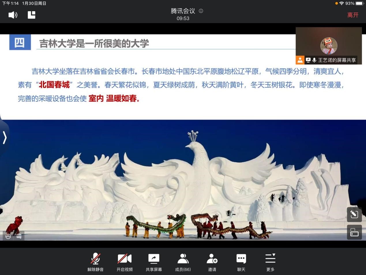 2022年1月30日下午,李逸然同学所在的招生宣讲团队在母校延边第二中学正式开始了招生宣讲。由于疫情管控要求,团队通过腾讯会议举办了线上宣讲。队长王艺诺同学主持了本次宣讲会,其他团队成员作为与谈嘉宾,对主讲内容进行补充。宣讲会主要分为两大部分,第一部分为校情陈述,由主持人借助学校的招生视频等资料,从学科实力、校园环境到衣食住行,对91网