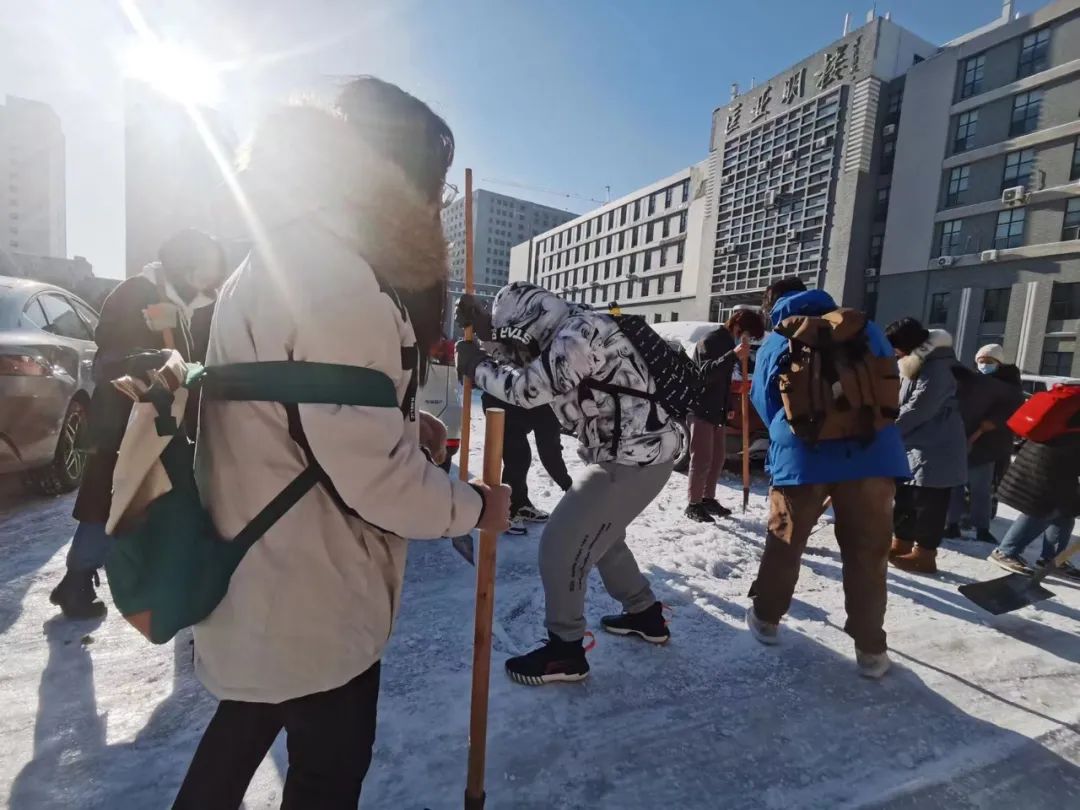 各位党员同志顶着凛冽寒风,一路取出铲雪工具,分为铲冰和清雪两组合作进行。同学们不畏严寒,积极主动配合。开始的时候,大家都不太熟练,时间过半,大家纷纷找到了技巧,分工合作愈发娴熟,铲雪的速度也越来越快,不仅如此,人群中渐渐传出欢声笑语,大家越干越有劲头。