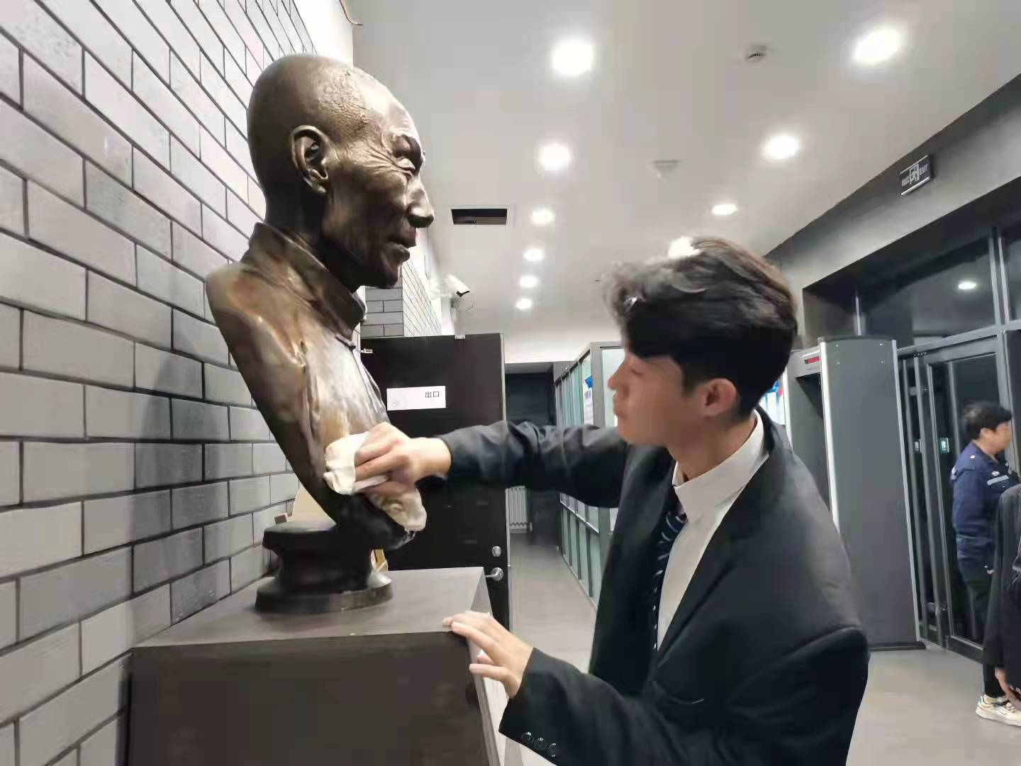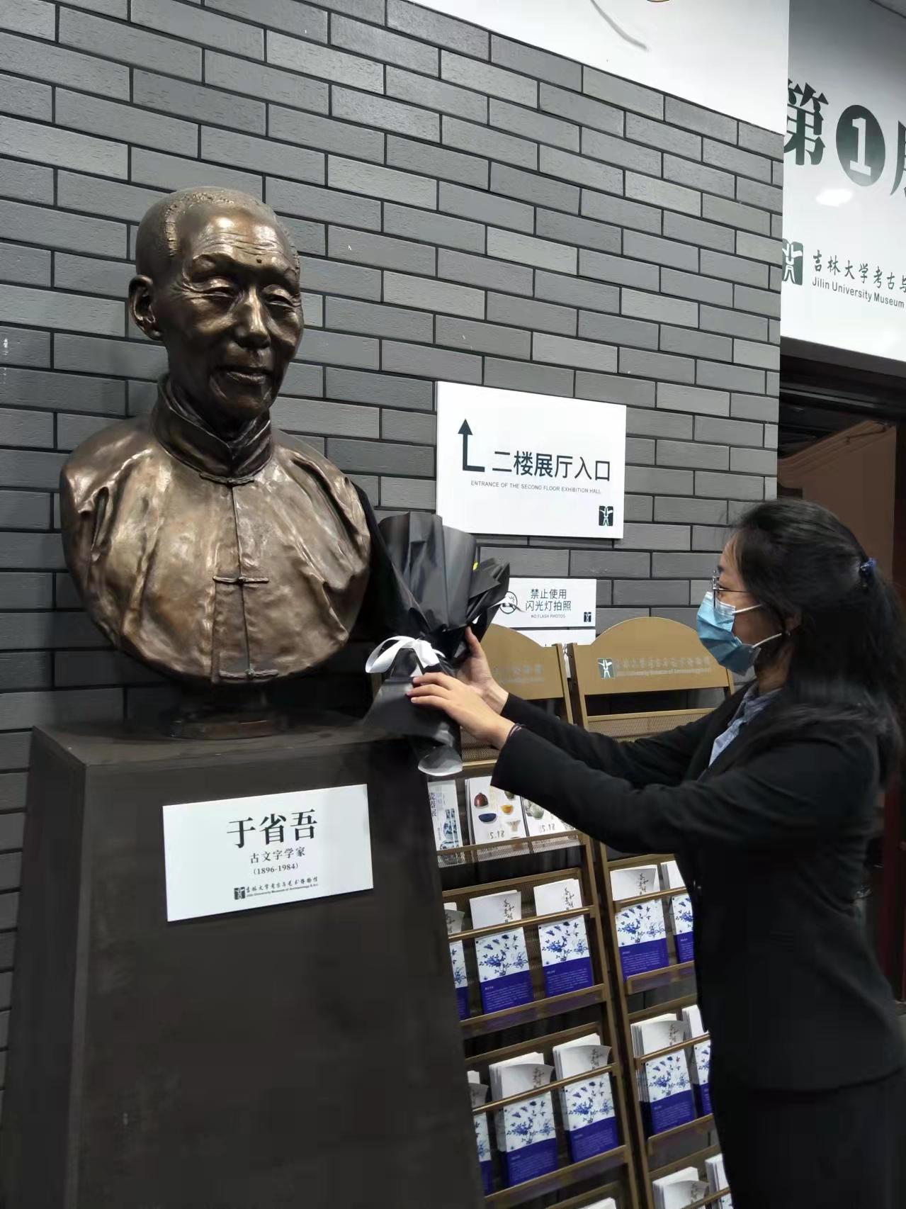 上午10时,各位学生代表怀着无比崇敬的心情来到考古与艺术博物馆,聚集在吉大先贤于省吾先生的雕像前,举行庄重的祭扫雕像仪式。首先,张馨予同学代表学生发言,认真梳理了吉大的优秀文化基因和思想精华,深切追思于省吾先生在中国古文字、古器物研究和古籍整理研究领域的卓越成就与伟大贡献,并自勉继承先贤遗志,发扬先贤精神。随后,同学们自发而有序地清扫了于省吾先生的雕像,用实际行动表达了自己的崇敬与缅怀之情。最后,学生代表果香凝同学向于省吾先生的雕像敬献花束,全体同学鞠躬并肃立默哀,表达对先贤的无尽敬仰与深切追思之情。