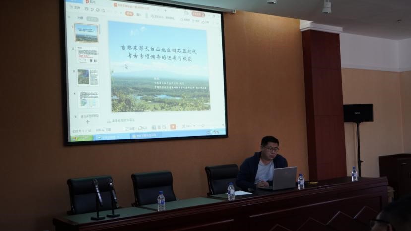 随后,吉林省文物考古研究所的老师们就吉林省近几年考古重大发现进行汇报。首先,业务办公室主任徐廷向同学们介绍了吉林东部长白山地区旧时代考古专项调查。长白山地区发现旧石器遗址,最早可以追溯到上世纪六十年代,安图县发现“安图人”洞穴,在共生的动物化石中获得了一枚古人类牙齿化石,碳14测定结果,属于旧石器时代晚期,距今3万~2万年,证实了吉林省曾有远古人类生存。之后吉林省又陆陆续续发现了很多旧石器时代的遗迹,这些以黑曜岩为主要原料的旧石器时代晚期遗址,围绕长白山天池集中分布,让考古人员相信长白山文化的发源可能距今几万年时间。2015年,考古人员开始在长白山地区开展远古遗址的专项调查,2019年经过吉林省文物考古研究所申请,“长白山地区旧石器考古的专项调查”立项,正式开始系统的、大规模调查长白山地区的旧石器时代遗址分布情况,填补相关的空白。