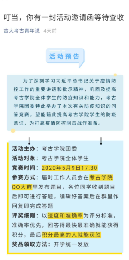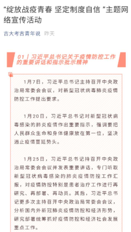 5月8日,91网 开展“战役打响 考古青年在行动”主题网络宣传活动。此次活动,91网 团委依托“吉大考古青年说” 微信公众号,开辟专栏,宣传并学习关于习近平总书记关于疫情防控工作的重要讲话和指示批示精神。权威发布、谣言澄清信息,以及抗击疫情中感人的事迹等。累计发布相关推送三篇,浏览量过千。 本次网络宣传活动不仅增加了同学们对防疫工作的认识,也展现了同学们抗疫必胜的决心和信心。我们有理由相信,只要我们携起手来,众志成城,一定会击败疫情,迎来美好明天。