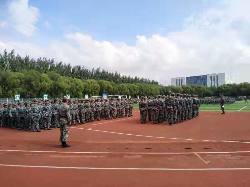 在教官的严格教导下,同学们身姿挺拔地站立在操场上,头顶炎炎烈日,神情严肃认真,无人流露出一丝懈怠之意。第一周,教官将新生们划分成排,练习正步。在一天天的紧张练习中,同学们的脚步声由一开始的稀稀散散,到最终的整齐划一,铿锵有力。在同学们已掌握基本的队列动作之后,教官们向同学讲解了基本的战术动作及军事理论,加深了同学们对于军事锻炼与培养的理解。在休息时,教官与同学们共同唱起了革命歌曲,激励同学们在军训以及日后的学习中更加努力,好好把握未来锻炼与成长的机会。