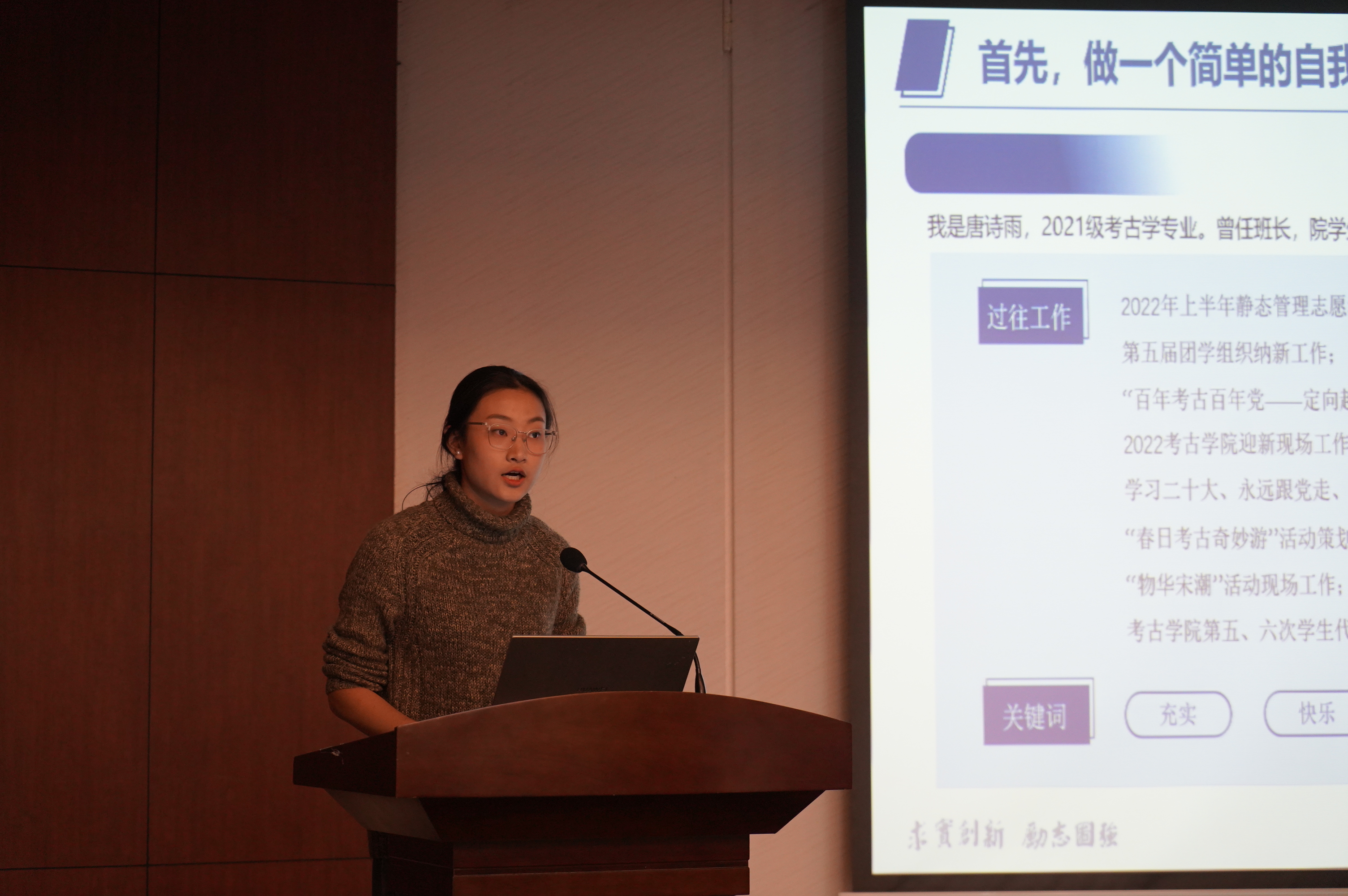 接着,2021级文博班杨芝卿在分享中提出“晴耕雨读,踔厉奋发”八字守则,以学生活动和社会实践为主线,从重要性、组织活动流程、学生活动与社会实践相结合三方面进行分享,并以首个自己独立策划的活动“春日考古奇妙游——公众考古文化节”为案例进行剖析。在社会实践方面,她向同学们推荐了“中国青年志愿者”公众号及“到梦空间”系统,结合现实案例鼓励同学们积极参与社会实践,提升自我综合素质。最后,杨芝卿鼓励同学们勇敢尝试,用心投入,学会反思,珍惜时光。