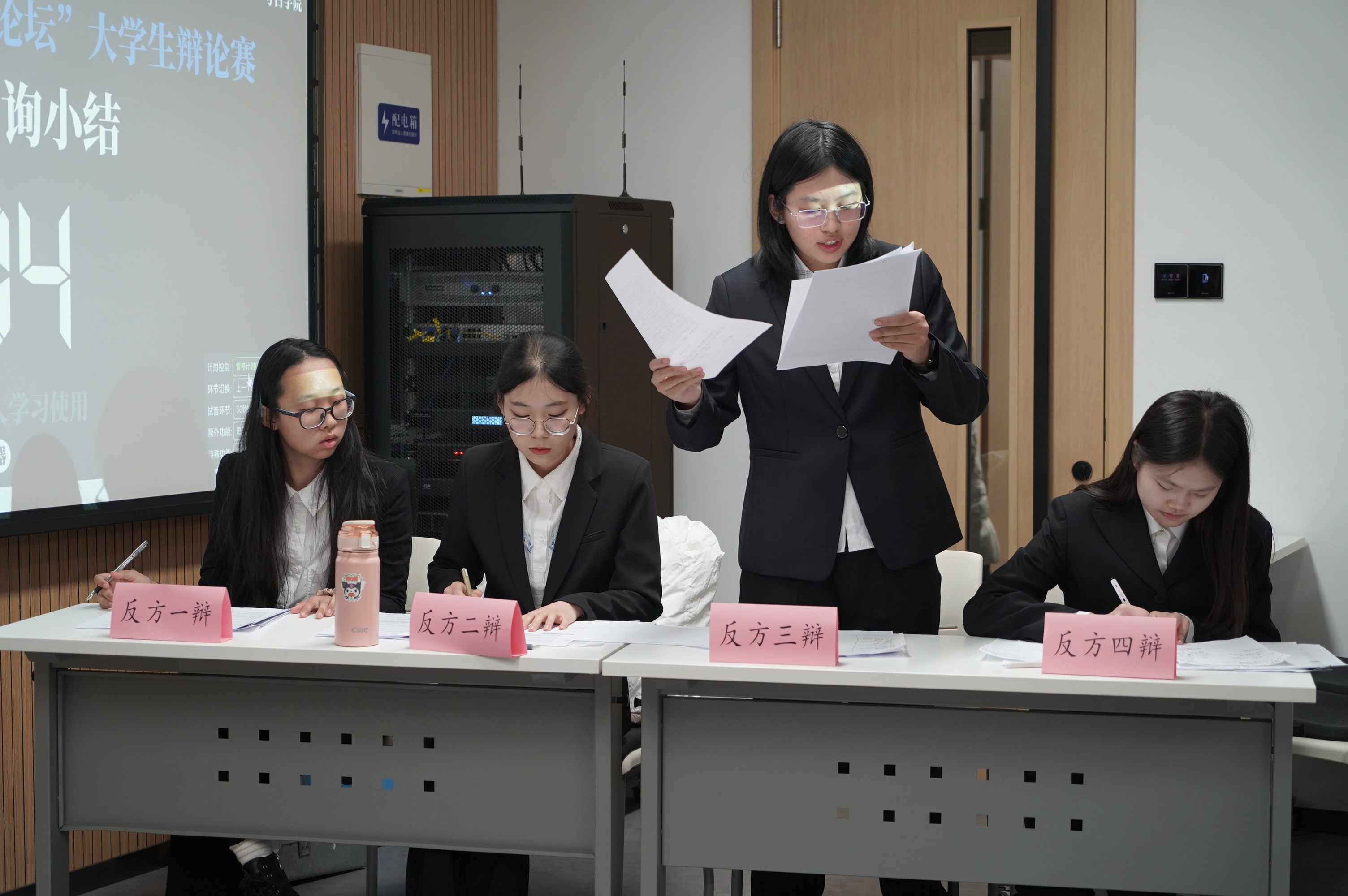 辩论队对战护理学院辩论队,持“超前的消费观念和行为对社会经济发展弊大于利”观点。队员赵亦婴、李雨桐、程玉星、成荃准备充分,与对方唇枪舌剑、你来我往,凭借出彩的临场发挥和默契配合成功晋升八强;辅导员邱泽涵老师也在现场见证了这一时刻。反方四辩成荃精彩的辩论为她赢得了“最佳辩手”称号。