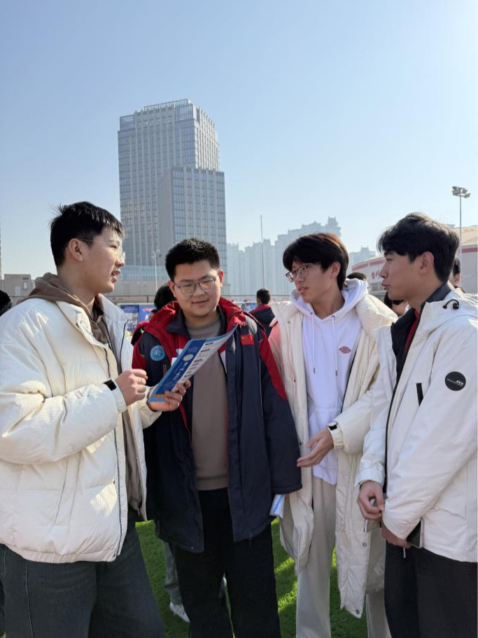入校后,队员们按校方要求在操场布置场地,2022级王亚祺和2023级姚宜丰负责基础答疑与人员分流,其余成员按专业分组,为分流后的学生提供进一步专业解答。