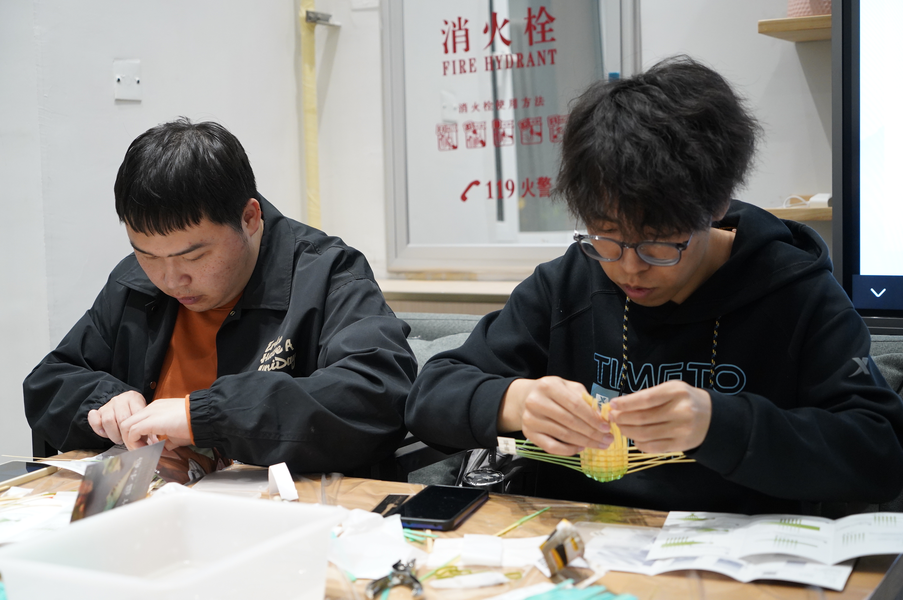 在现场志愿者的引导下,同学们纷纷投入到竹编杯垫和竹船的制作中,在动手操作中感受着非遗文化的魅力。
